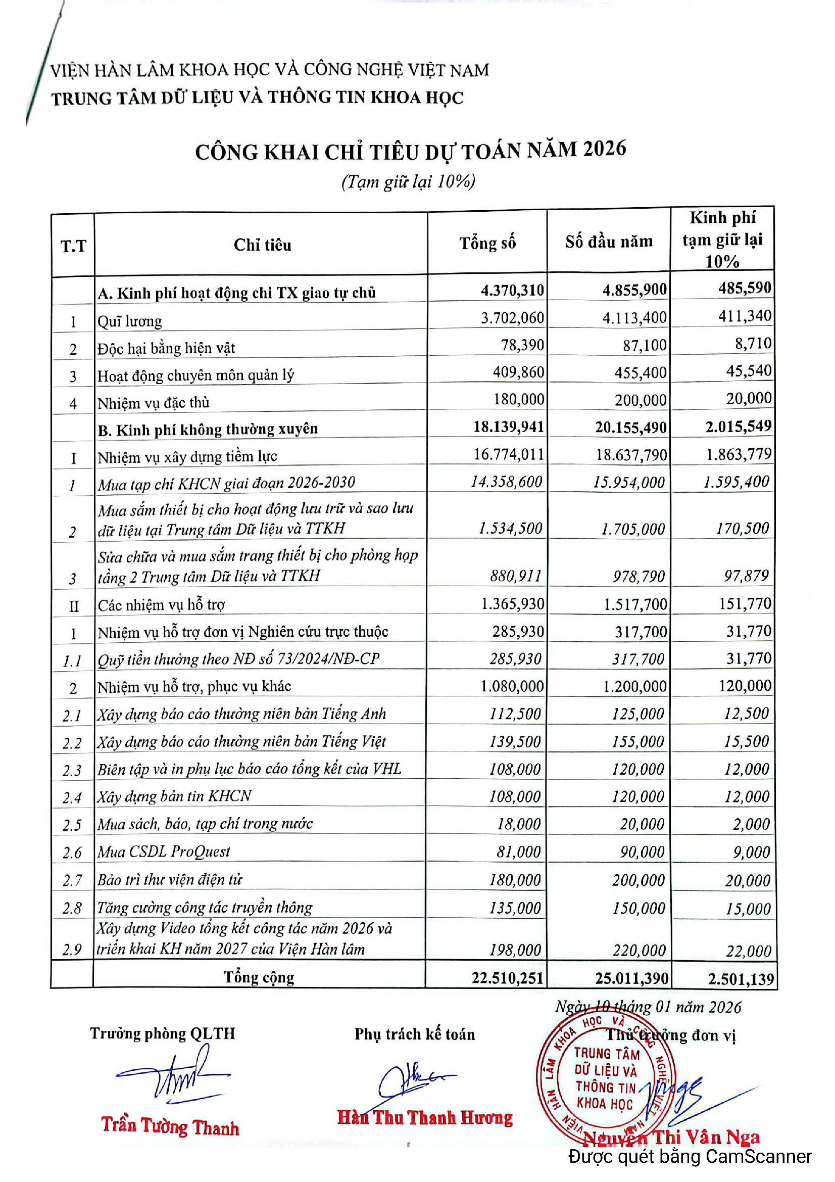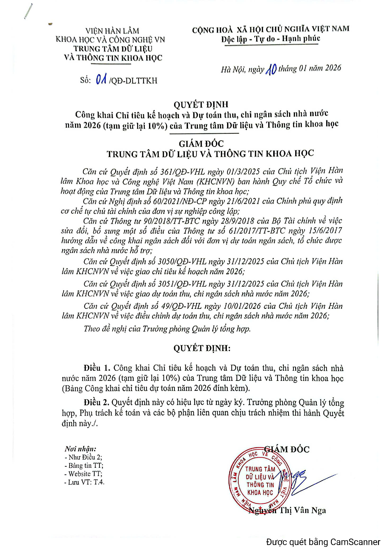 Trung tâm Dữ liệu và Thông tin khoa học ban hành Quyết định Công khai Chỉ tiêu kế hoạch và Dự toán thu, chi ngân sách nhà nước năm 2026 (tạm giữ lại 10%) của Trung tâm